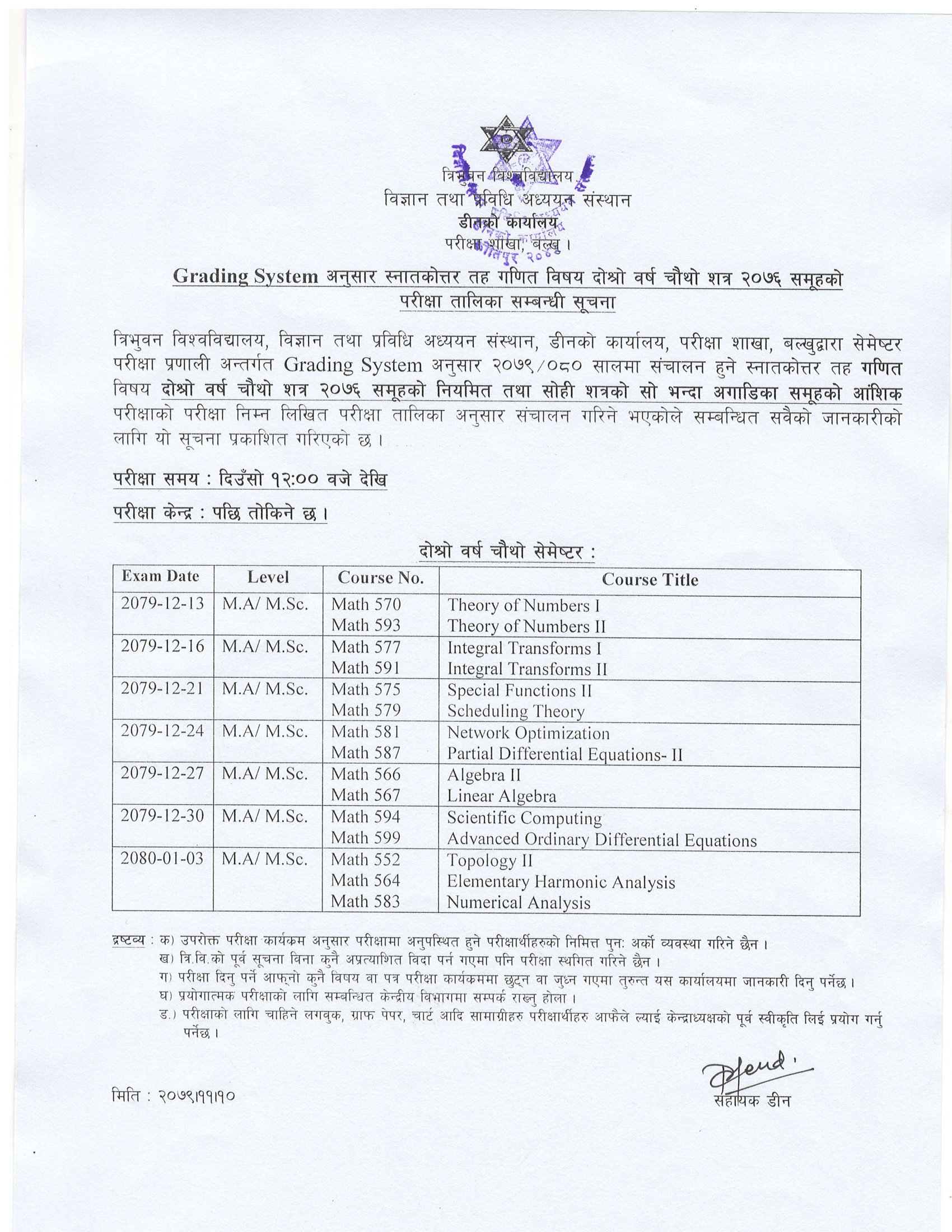 M.Sc. Math IV Semester-2076 Exam Routine