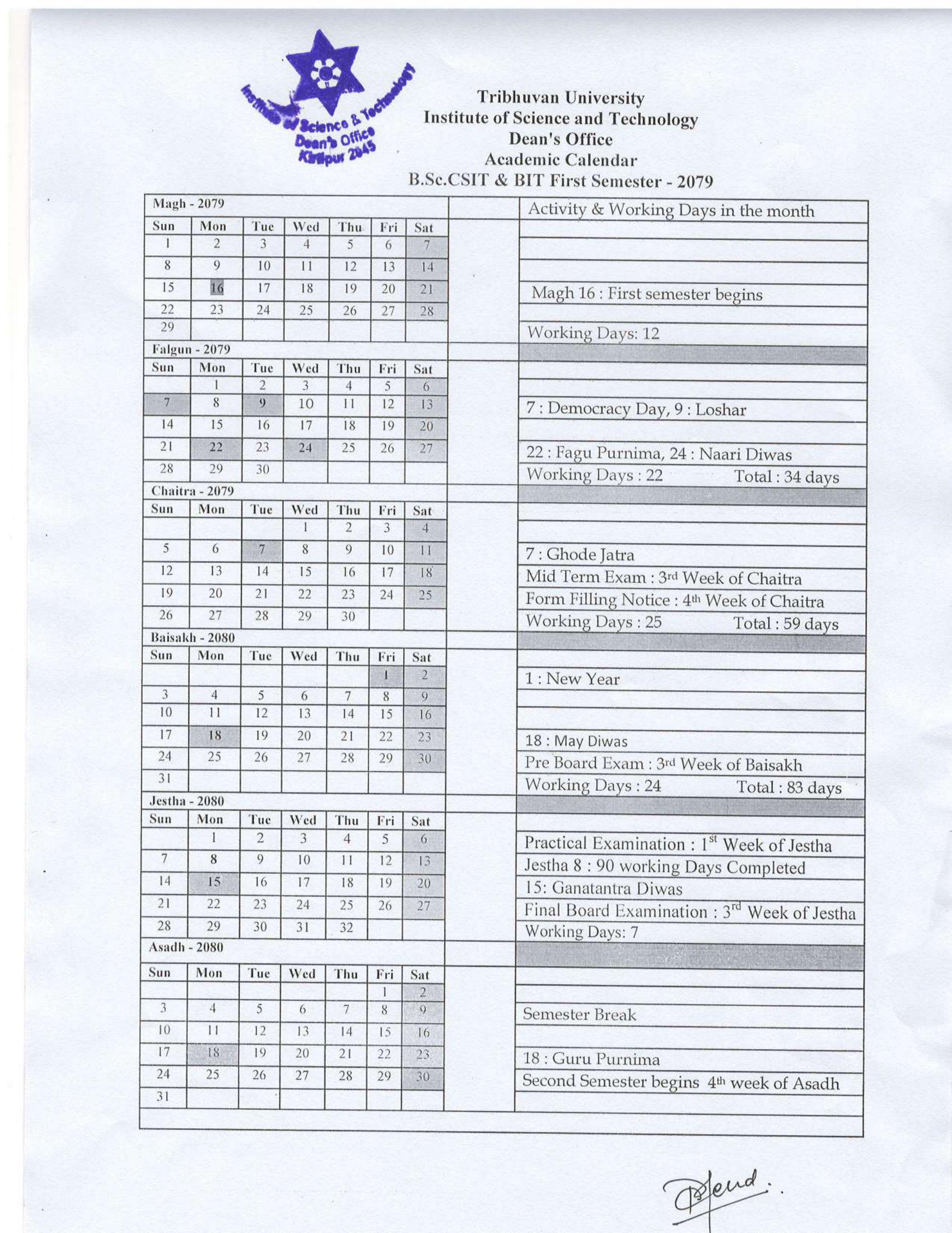 Academic Calendar of B.Sc.CSIT & BIT First Semester-2079