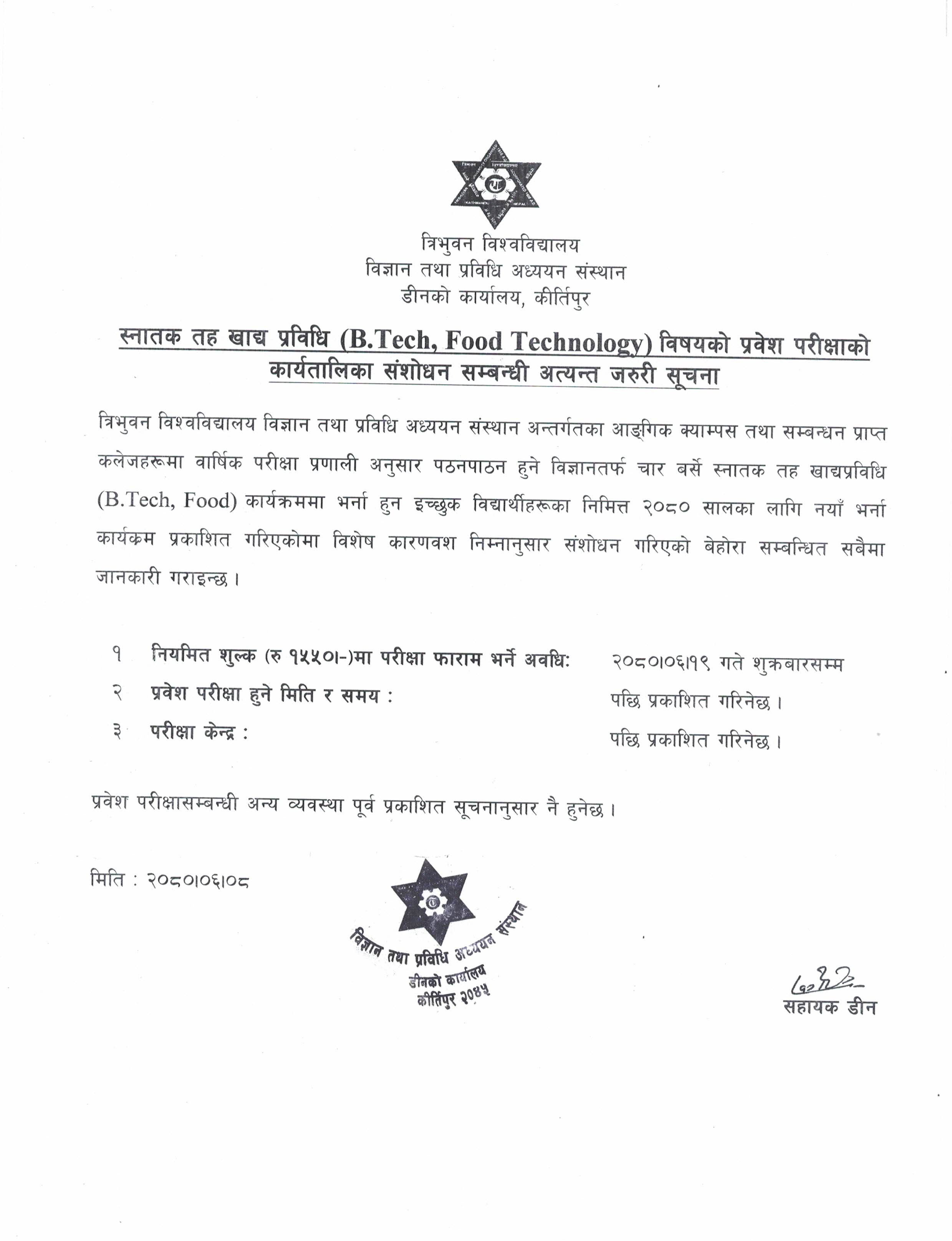 1 B.Tech (Food Technolgoy). भर्ना २०८० का लागि प्रवेश परीक्षा कार्यतालिका संशोधन सम्बन्धी अत्यन्त जरुरी सूचना jpg