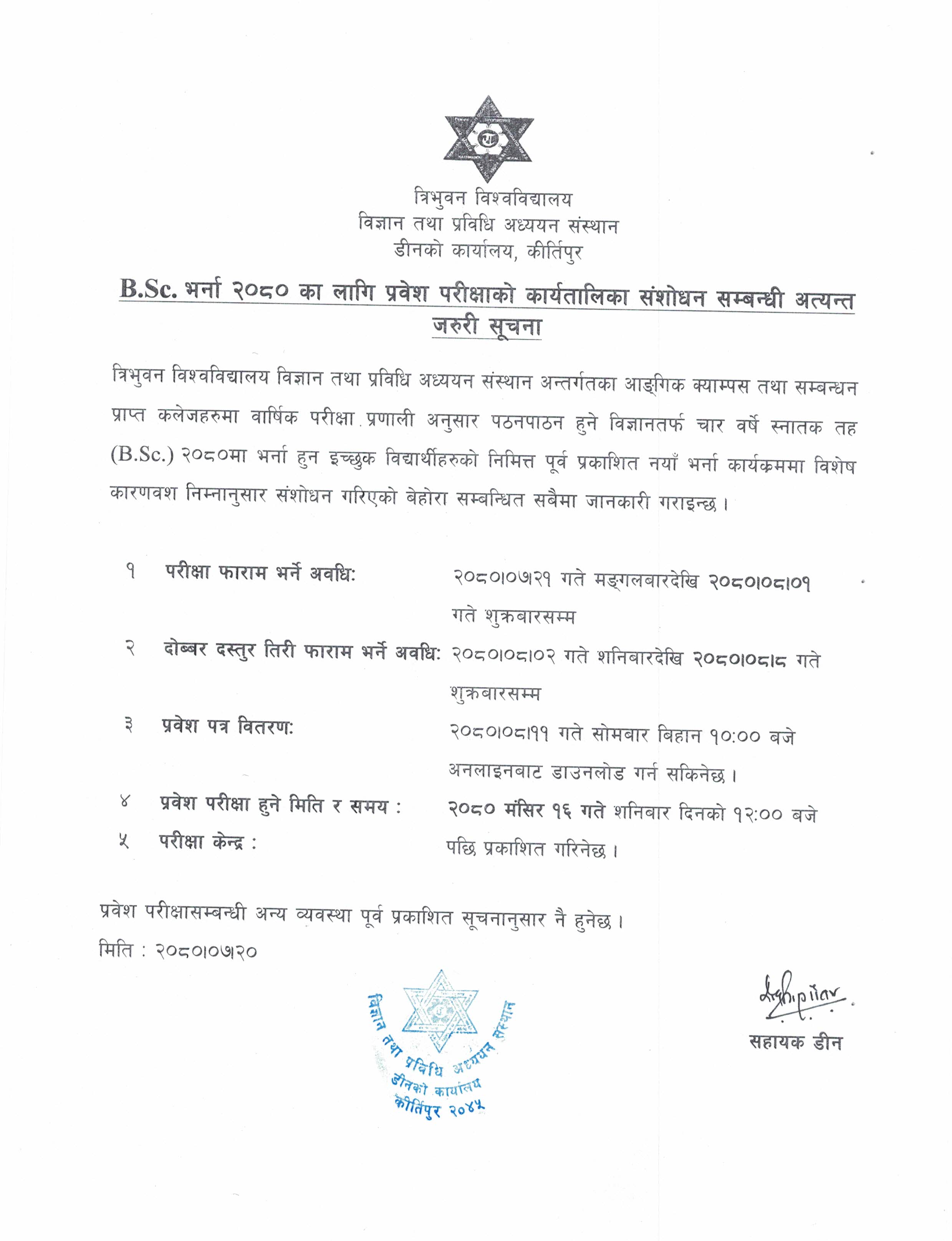 B.Sc. भर्ना २०८० का लागि प्रवेश परीक्षाको कार्यतालिका सशाेधन सम्बन्धी अत्यन्त जरुरी सूचना