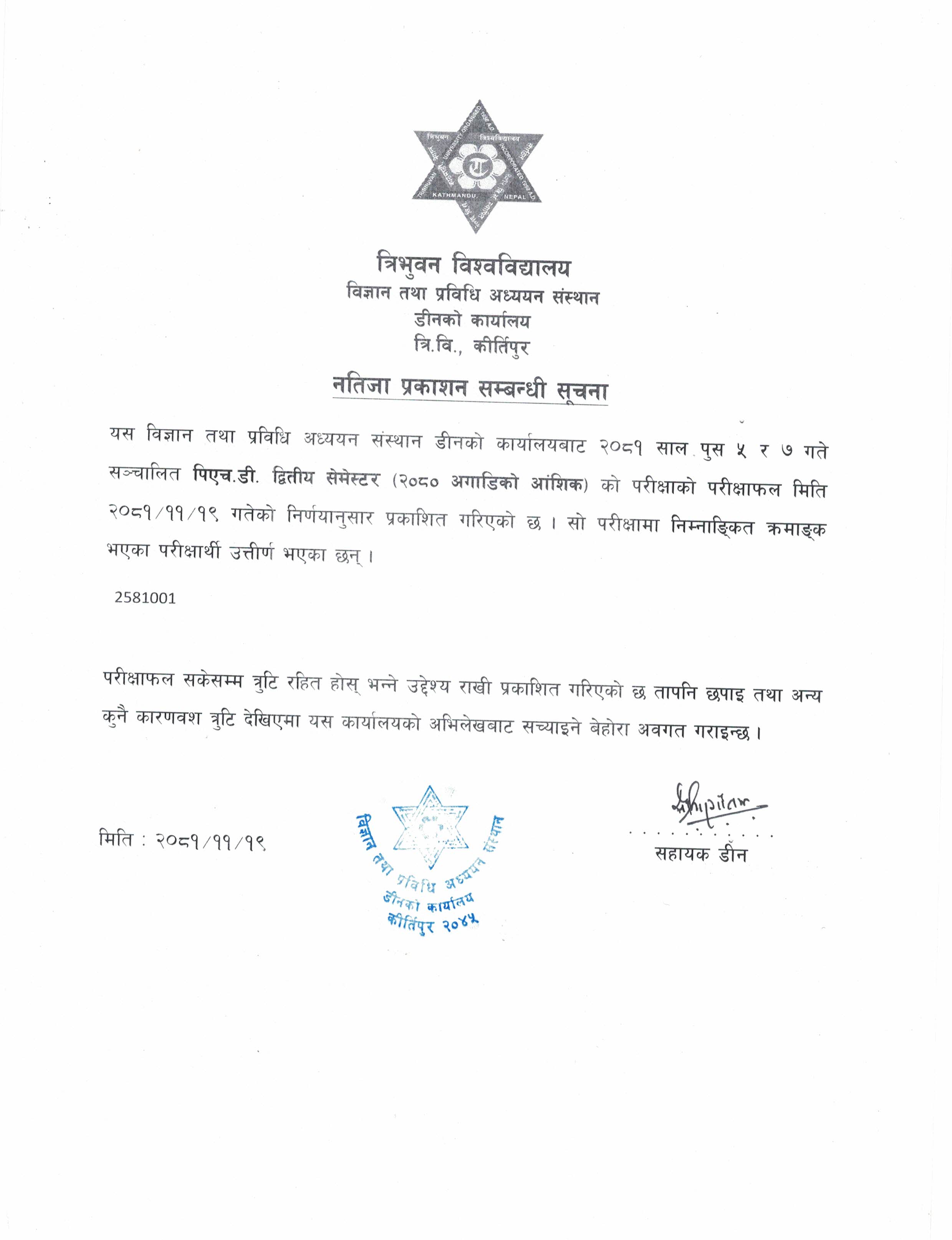 विज्ञान तथा प्रविधि अध्ययन संस्थानको सहायक डीन छनाेट समितिको सूचना
